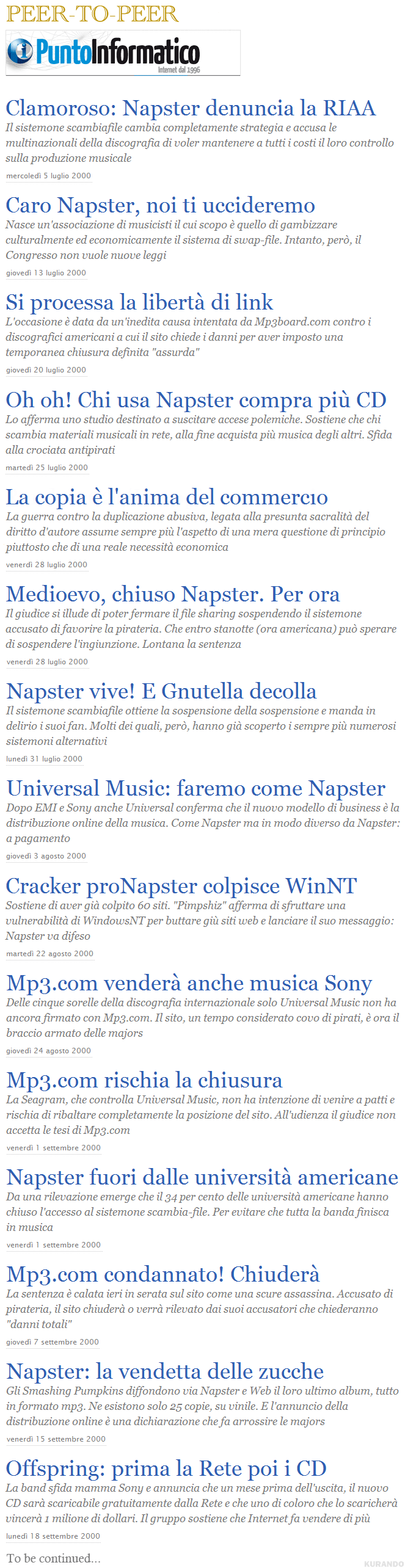 Luglio 2000, Agosto 2000, Settembre 2000, Napster, RIIA (Recording Industry Association of America), Swap-file, Mp3board.com, CD, Gnutella, Universal Music, EMI, Sony, Pimpshiz, WindowsNT, Seagram, Mp3.com, Smashing Pumpkins, Mp3, Vinile, Majors, Offspring.