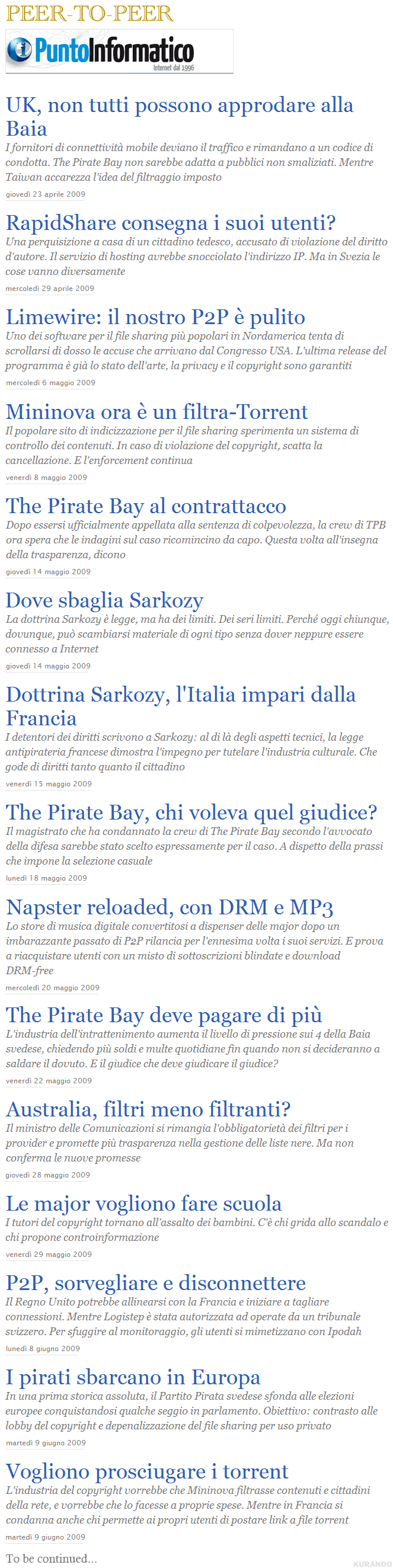 Settembre 2009, Ottobre 2009, Pay Bay, Global Gaming Factory, Rootkit, Sony, CD audio, Dottrina Sarkozy, The Pirate Bay, Brasile, Spotify, Brokep, iTunes, Eminem, Giappone, Isamu Kaneko, Winny, Norvegia, Telenor, ISP (Internet Service Provider), RIIA (Recording Industry Association of America), New York, Ray Beckerman.